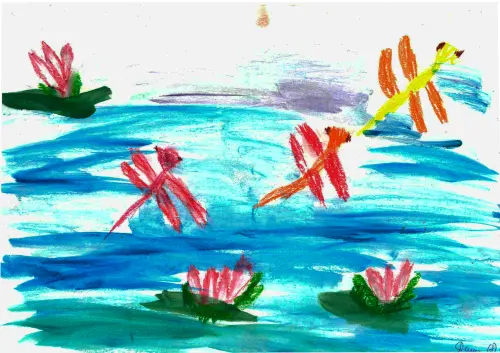Когда мы гуляем на Ясном пруду я всегда там вижу красивых стрекоз и еще интересные цветочки, которые я изобразила на своем рисунке. Я люблю гулять на нашем красивом Ясном пруду.