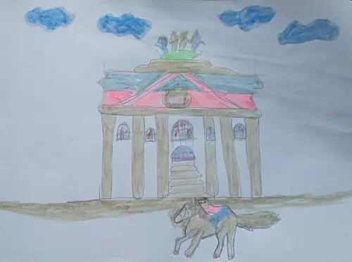 Рисуя эту картину, наша дочь вдохновлялась прогулкой рядом с Ипподромом – замечательное место, особенно замечательны его обитатели, мы очень любим полюбоваться лошадками при первой возможности.