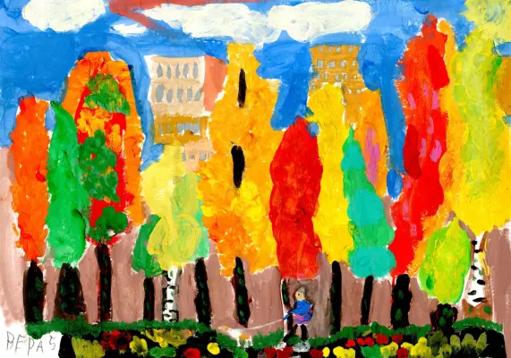 Вера любит рисовать гуашью, работа получается яркой и насыщенной. На работе изображена прогулка с собакой наставника Старой Школы, где обучается Вера. Район этот хорошо знаком и любим, т.к. именно туда мы приходим в нашу школу на рисование. Именно с ним связаны тёплые воспоминания.