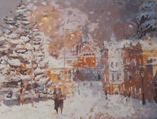 На картине изображен зимний, московский вечер. Вдали видна башня Кремля. На переднем плане открывается вид на пару, которая тихонько бредёт по заснеженной московской улице. Цвета на картине передают атмосферу тихого, сказочного вечера в нашем замечательном городе .