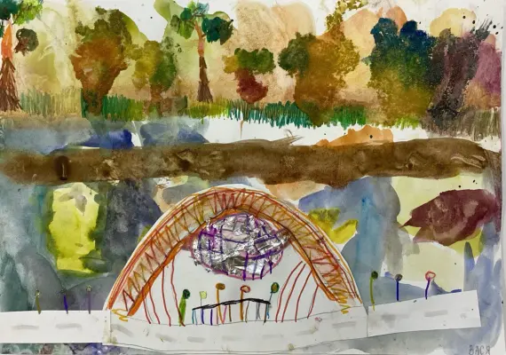 На картине изображен знаменитый на всю Москву Живописный мост через Москву-реку. За ним виднеется мой любимый Серебряный Бор. В одном рисунке собраны красоты моего района.