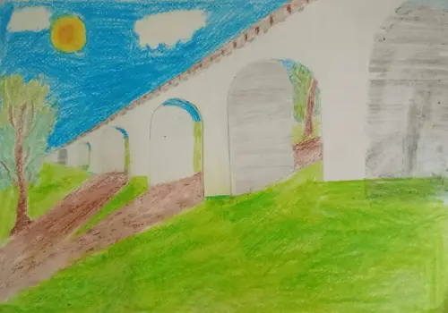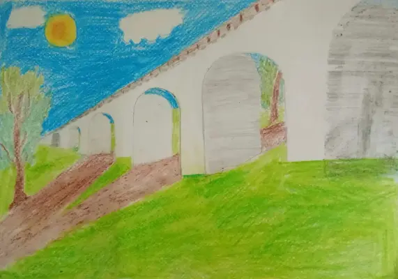 На моей картине изображен Ростокинский акведук, величественный архитектурный памятник, возвышающийся над водной гладью. В своей работе я постарался передать величие и красоту Ростокинского акведука, его историческую ценность и гармоничное включение в окружающий ландшафт.