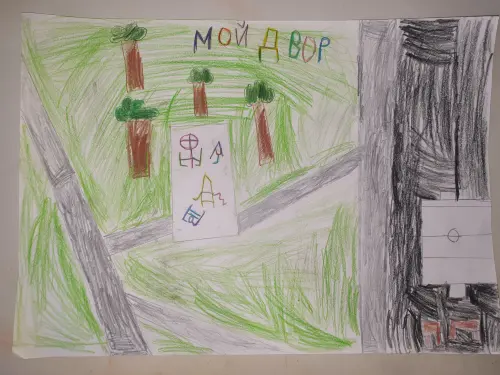 Я люблю гулять в своём дворе. Он мне нравится, потому что здесь есть большая спорт площадка и детская площадка с горками и качелями. Мой двор очень зеленый и уютный: в нем много больших деревьев и есть скамейки.