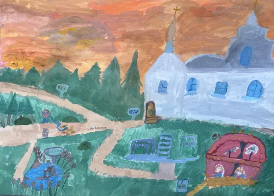 На рисунке я изобразила Церковь Покрова Пресвятой Богородицы в Покровском-Глебове-Стрешневе, плотину Бобров, которая находится недалеко от родника «Царевна Лебедь» в природно-историческом парке Покровское-Стрешнево и спортивную площадку, на которую мне нравится ходить с папой. Я люблю это место, потому что там свежий воздух, спокойно, можно гулять и слушать пение птиц. Летом мы очень часто ходим туда всей семьей. А еще я изобразила любимую карусель на площадке «Московских Сезонов», которая находится неподалеку, через Волоколамское шоссе, на улице Авиационной, Щукинского района.