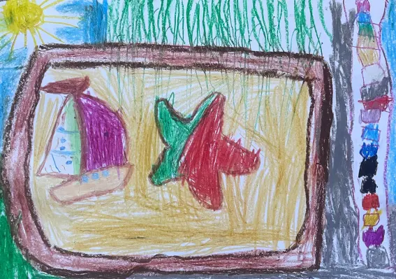 Так сразу и не скажешь, но ребенок нарисовал окно своей комнаты, разноцветные занавески и вид из окна на песочницу, в которой он любит играть. Он очень хочет поехать на море, но пока не может. Так он представляет, что играл бы на пляже в песочке у моря, строил бы пирамиды, куличи и загарал бы под солнышком.