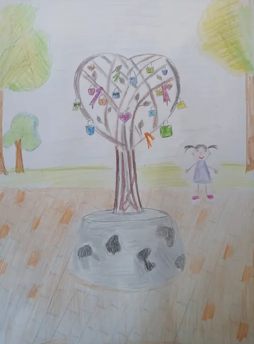 Я живу в городе Троицк. Очень люблю гулять, наше любимое с мамой место — Дерево любви. Это такая скульптура, она очень необычная. Больше всего люблю рассматривать замочки и ленточки, которые вешают на него женихи с невестами.