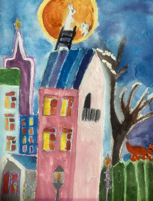 Мы живем недалеко от центра Москвы, из моего она виден МГУ, башни сити, много других домов. Ночью, когда загорается свет в домах, все кажется волшебным, я изобразил мой вид из окна сказочным