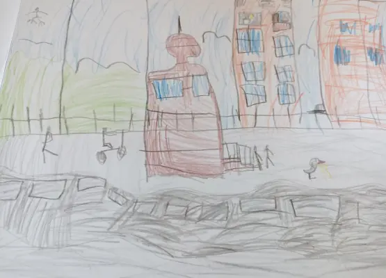 Это чайки, которые летают над нашим домом и дружат с другими птицами, их я тоже нарисовал. Я нарисовал и окна и нашей квартиры, и мамины цветы на подоконнике, и наше с братом окно, где видно мои игрушки. Слева ч нарисовал наш лес, куда мы ходим гулять на лыжах и просто смотреть, как растут трава и деревья, как меняется цвет листвы, как скачут белки. А зимой мы вешаем кормушки и кормим птичек в лесу, а мама рассказывпет, что им можно давать покушать, а что нельзя, чтобы они были здоровые и не улетели из нашего леса. Я люблю там гулять и считаю себя большим любителем природы.