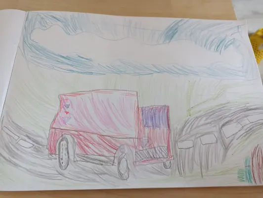 На этой картине я нарисовал Дмитровское шоссе, которое находится рядом с моим садиком. По нему часто ездят большие машины, грузовики, они мне нравятся.