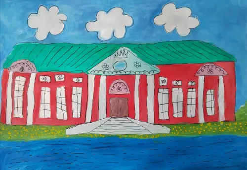 «Кусково» — место, где мы любим гулять всей семьей в любую погоду. Здесь красивый парк, много детских площадок, а в центре — дворец с прудом! Его я и нарисовала: он яркий, украшен цветами и можно представить себя принцессой, когда здесь гуляешь.
