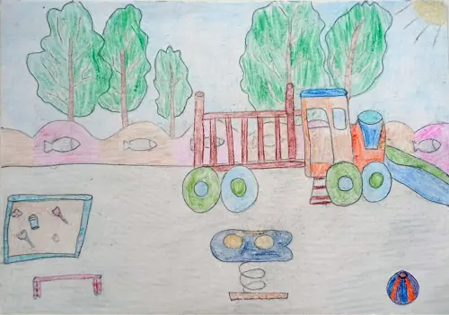 Это моя родная площадка, она находится возле дома и это вид из моего окна на неё. Я очень много времени провожу на ней. Катаюсь на качелях, горке. Очень люблю песочницу. А ещё зимой родители устанавливают ёлку и украшают площадку серпантином.