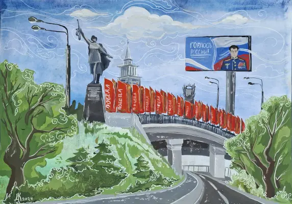 Я нарисовала Мост Победы, который находится рядом с моим домом. На 9 Мая он всегда украшен флагами в честь победы в Великой Отечественной Войне. Смотрится это очень торжественно, особенно в сочетании со скульптурами воинов Н.В. Томского. А сбоку от моста на билборде изображение современного героя, защищающего нашу страну в 2024 году. Связь времен, связь поколений!