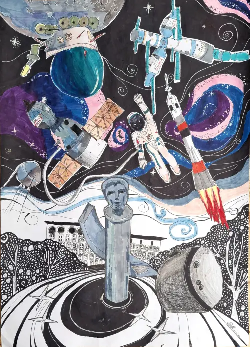 На моей работе внизу черно-белый земной мир: дом, деревья, основание памятника. А верхняя часть работы — яркий космическо-фантастический мир: станция «МИР», «Союз-7», «Союз-11», луноход, первый электронный спутник, космонавт, Луна. А сам памятник как-бы связывает эти два мира.