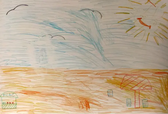 Я с мамой и папой отдыхала на пляже у речки Десна. Мне понравился песочек. И солнышко, и было тепло. Я люблю это место. Я его нарисовала. Я люблю загорать.