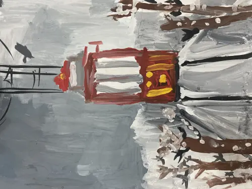 В моем районе курсируют не только электробусы, но и старый вид транспорта, которому 125 лет - это Московский трамвай. Как прекрасно прокатиться на трамвае по району. Работа выполнена гуашью.