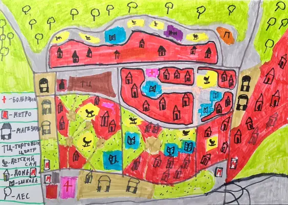 Самый лучший район Москвы — Косино-Ухтомский. На моем рисунке изображён мой микрорайон Кожухово. Здесь есть огромный лесопарк, куда любят ходить жители района, в парке обитает огромное количество птиц и животных, в том числе редких. Улицы микрорайона Кожухово названы в честь героев ВОВ, реки Руднёвка и Святого озера. Неподалёку от Святого озера располагается православный Храм. Много детских площадок, развитая инфраструктура. На моём рисунке много зелёного цвета — это потому, что район густо засажен деревьями и цветами. Красный цвет — это потому, что много домов из красного кирпича.