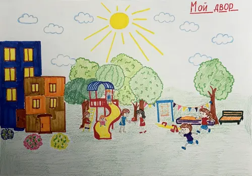 В моей работе я нарисовала свой двор, я очень люблю это место! Люблю играть на площадке со своими друзьями, каждый день мы придумываем новые игры и никогда не сидим на месте, мы очень весело проводим время в своем дворе. Для меня он самый лучший !