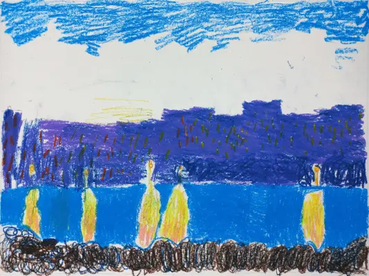 Я решила нарисовать пруд в нашем районе, вокруг него вечером очень красиво горят фонари, а еще прямо из пруда бьют фонтаны! Очень люблю гулять вокруг прудов.