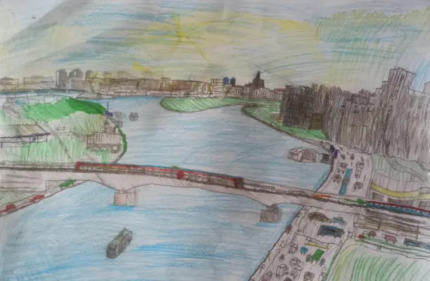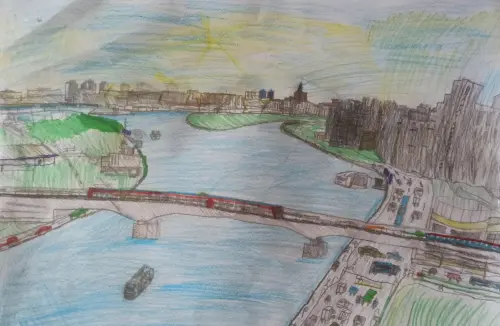Я живу в прекрасном районе Москвы -Нагатин-Садовники. Наш район очень красивый, зелёный. Недалеко от моего дома находится замечательный исторический парк Коломенское, где я люблю гулять со своими родителями и друзьями. А ещё мне очень нравится прогуливаться летними вечерами по нашей набережной и любоваться видом на Москву реку, смотреть на электрички метро, которые проезжают по метромосту и новые речные трамвайчики, которые идут навстречу друг другу. Также недавно по метромосту запустили новый поезд, Москва 2024! Для меня это очень большое событие, тк я интересуюсь метро, его развитием и строительством новых станций, и, конечно же, поездами! В своей работе я изобразил нашу набережную, речные трамвайчики и мой любимый поезд!