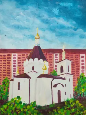 Я решила его изобразить, потому что он для меня является символом веры, символом духа народа, и конечно любви. Мне нравится внешний вид православных церквей и, как золотистые купола переливаются на солнце. Всё это я хотела передать в своей работе.