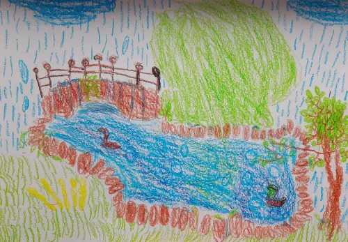Мне очень нравится гулять в Терлецком парке, и рисовать все, что вокруг. На этой картине изображен небольшой пруд, берега у него укреплены деревянными бревнышками, что очень красиво смотрится, а в самом водоеме любят полавать утки, которых я тоже нарисовал. По краям пруда растут декоративные кустарники и обычные ивы. Рисунок создан в июле 2024 года во время прогулки.