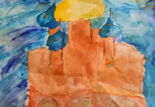 На картине изображен большой собор иконы Божией Матери Донской в Донском монастыре. Меня впечатлила красота этого собора и то, как его золотой купол переливается на солнце.