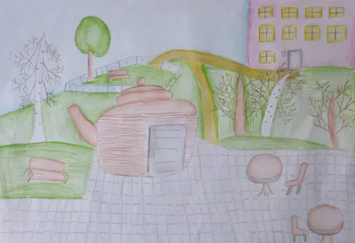 Рисунок выполнен цветными карандашами. На рисунке изображен чайник – достопримечательность Зеленограда, находится в парке 5 микрорайона МЖК. На заднем плане – парк и жилой дом.