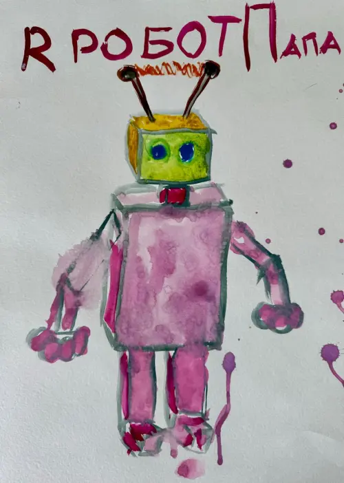 Кто-то принес робота на детскую площадку и оставил. Тимура очень впечатлил это робот, ему захотелось его нарисовать. Этот робот до сих пор ждет детей на детской площадке во дворе, чтобы с ним поиграли.