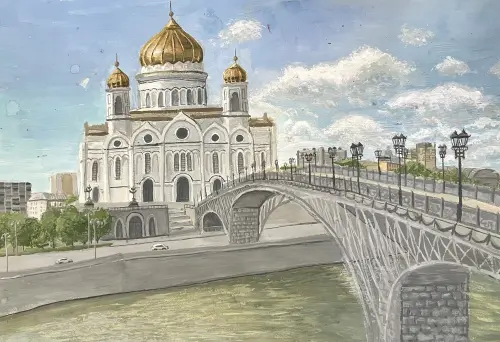 Я изобразила Храм Христа Спасителя и Патриарший мост. Существующее здание ХСС — воссоздание одноимённого храма, разрушенного в 1931 году. Это самый большой православный храм России.
