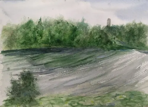 Парк Звёзд в Крылатском, берег Москва-реки. Одно из хороших мест для прогулок в моём родном районе. Река прекрасна в любое время года, здесь она изображена этим летом. Бумага, акварель