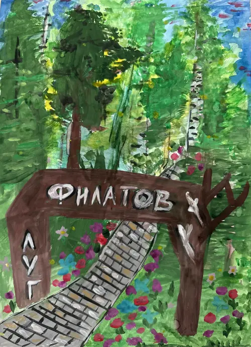 Это очень красивый, живописный, очень большой парк — Филатов луг, который входит в состав Ульяновского лесопарка. Я люблю здесь гулять с родными. Тут есть и прогулочные зоны и детские площадки и места для занятия спортом и качели для всех возрастов. Здесь, в нашем парке, очень зелено, приятно, прохладно в летний зной, по дорожкам бегают белки и для птиц обустроены кормушки. Есть велодорожки, места для пикника, волейбольная площадка, футбольное поле, беседки со скамейками, эко-тропы. Здесь прекрасно в любое время года. На моем рисунке один из нескольких входов в парк Филатов луг. Материалы: гуашь, акварель.