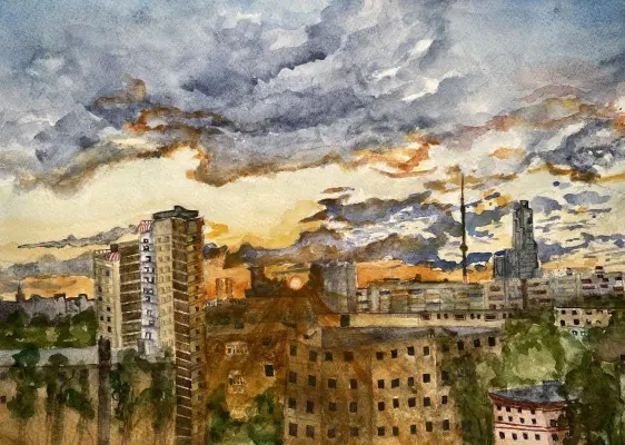 Для участия в конкурсе я нарисовала закат, который каждый день вижу из своего окна. Эти закаты удивительные и невероятно красивые. На фоне уходящего солнца открывается пейзаж вечерней Москвы. Где-то вдали я вижу огни Останкинской телебашни… А жилые дома и здания моего района утопают в закатной дымке. Облака напоминают пуховые перины, а последние лучи солнца нежно убаюкивают мегаполис. Природа столицы «вдыхает» вечернюю прохладу… как же красив мой любимый город!