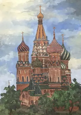Храм Василия блаженного, как сюжет для моей работы, я выбрала не случайно. На данный момент, этот памятник архитектуры является для меня самым красивым историческим сооружение моего города. Мне, как начинающему художнику, очень нравится это сооружение тем, что здесь умопомрачительное количество мелких изящных деталей. В своей работе я убрала все лишние детали современного мира и оставила храм наедине с природой (мне показалось, что это помогает сильнее прочувствовать всю историческую биографию этого произведения искусства). Я горжусь тем, что именно в моей стране есть огромное количество прекрасных исторических памятников архитектуры, которые являются раем для глаз!