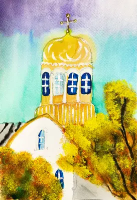 Я люблю со своей семьёй посещать церковь Сергия Радонежского, там очень красиво и уютно внутри, и мне нравится архитектура фасада этой церкви. Мой рисунок выполнен гуашью в формате А3.