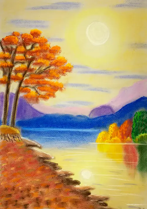 Мое любимое время года - осень. Именно в это время природа отличается многообразием красок. Мне нравится, как осенние деревья отражаются в воде. Мой рисунок выполнен в технике «сухой пастелью» в формате А3.
