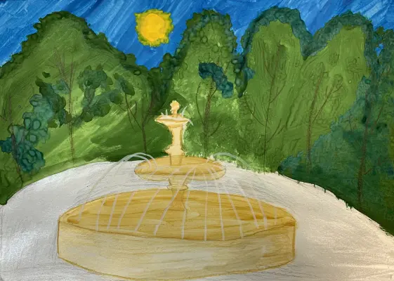 Мне очень нравится фонтан в сквере у памятника Героям-панфиловцам. Я часто хожу к нему и любуюсь сверкающими на солнце струями воды. Там всегда красиво летом на фоне зелёных деревьев. Мой рисунок выполнен гуашью.
