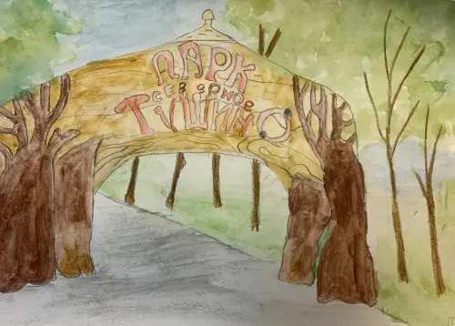 Я люблю гулять с родителями в парке «Северное Тушино». Мне очень понравилась там выставка сказочных скульптур, одна из которых украсила вход в парк. Мой рисунок выполнен акварелью.