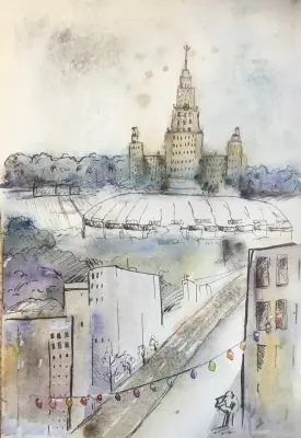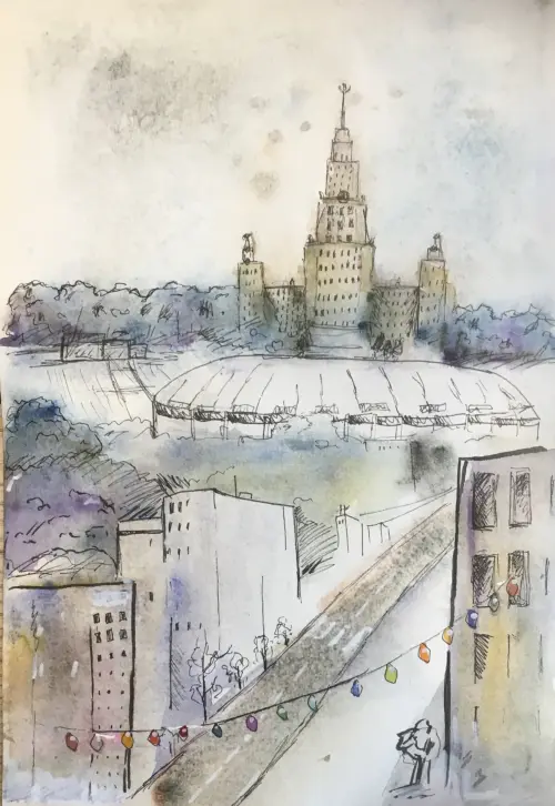 Нарисован городской вид на Воробьёвы горы из окна дома в Садовых Кварталах перед Новым годом. Работа выполнена в смешанной технике: акварель и чёрный линер
