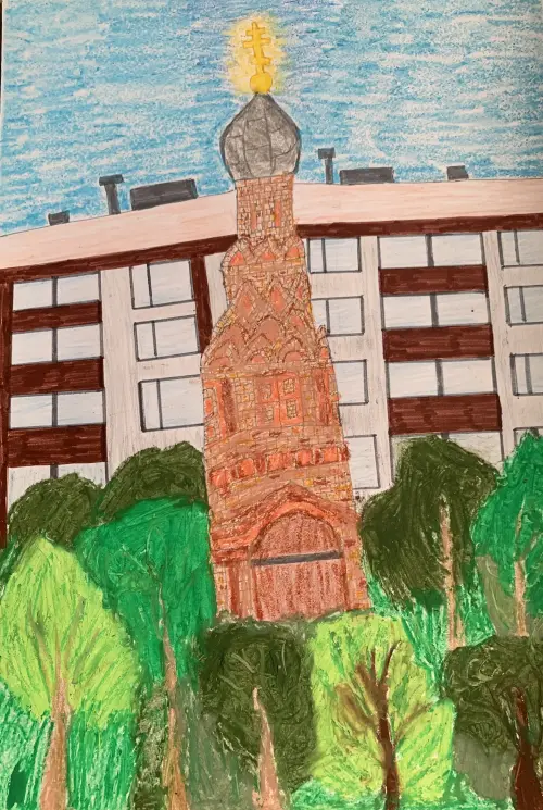Колокольня - часовня бывшего Казанского Головинского монастыря. Я любуюсь из окна красотой колокольни. По православным праздникам слушаю перезвон специальных пластин, т.к. колокола на колокольне нет. Мне хотелось передать красоту архитектуры этой колокольни