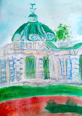 Одно из строений в Кусково (касса) выполнено акварелью, рисунок создан на пленэре в один из майских дней 2025 года, когда окружающее пространство пропитано ароматами цветов, а зелень юная и нежная.