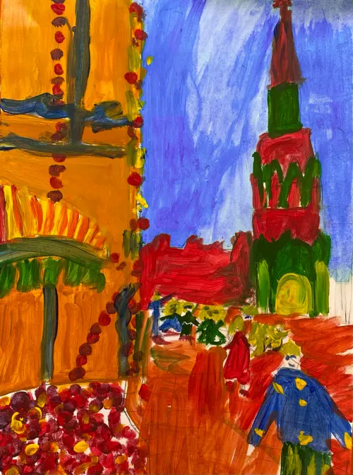 Яркий и жизнерадостный рисунок передает атмосферу праздничного дня в сердце Москвы. Слева — украшенное гирляндами здание ГУМа, справа — узнаваемая башня Кремля с красным кирпичом и зелёными шпилями. По брусчатке гуляют люди, наслаждаясь теплом и яркими красками. Картина наполнена детской искренностью и живостью — будто смотришь на мир глазами человека, впервые попавшего в центр столицы.