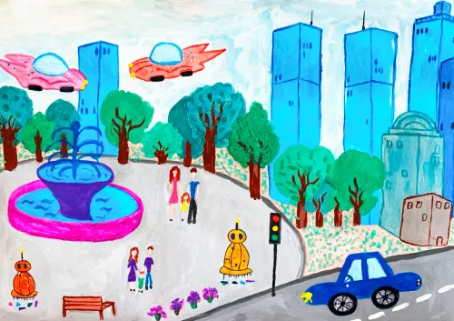 Этот рисунок переносит нас в мир будущего, где на улицах царит гармония технологий и природы. В центре — уютный городской сквер с ярким фонтаном, гуляющими семьями и дружелюбными роботами. Над деревьями летают футуристические автомобили, а на горизонте возвышаются сверкающие небоскрёбы.