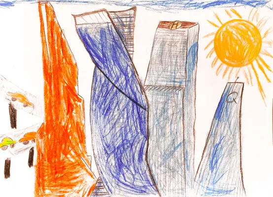 На этом рисунке изображён ультрасовременный мегаполис с футуристическими небоскрёбами, устремлёнными в яркое солнечное небо. Здания разной формы — изогнутые, наклонённые, остроконечные — выглядят как архитектурные чудеса. Особенно выделяется синий небоскрёб в форме спирали — он словно закручивается вверх, символизируя движение вперёд.