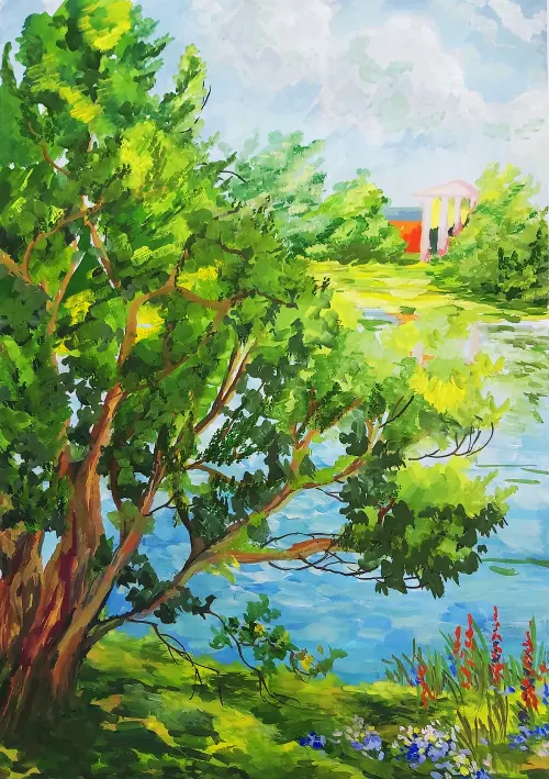 Пейзаж, который я нарисовала, получился по-летнему ярким и позитивным.
