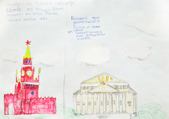 На рисунке изображены 2 достопримечательности Москвы. Красная площадь - достопримечательность, которая является главной площадью Москвы и России. Большой театр - этот театр особенный, в нём играют самые лучшие оркестры, актёры России и не только