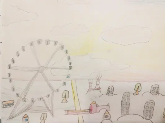 На картине изображено колесо обозрения «Солнце Москвы» на закате. Мы с мамой любим гулять на ВДНХ. Там очень красиво, особенно вечером. Я люблю свой город.