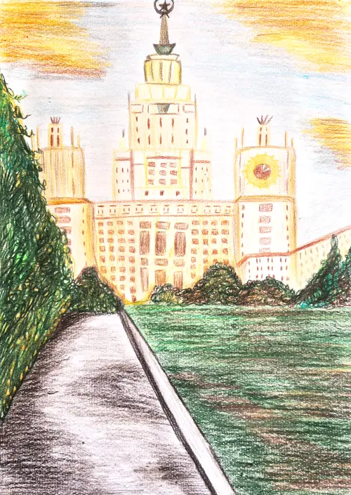 В этой работе я постаралась передать атмосферу осеннего прохладного вечера через игру света и тени. Вдохновение для работы получила от прогулки с подругой по аллее МГУ, встречая закат после тяжёлого дня.