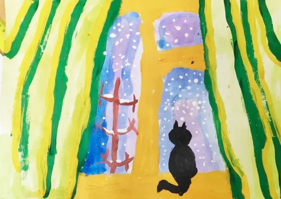 На картине изображён черный кот у окна, который завороженно с любопытством следит за падающими снежинками - каждое движение снега приковывает его внимание.
