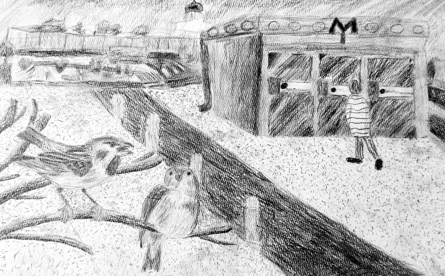 На картине изображены воробьи около выхода из метро «Братиславская». Они сидят на ветке дерева. Действие на рисунке происходит зимним утром. На заднем плане видно парк имени Артëма Боровика и церковь святых мучеников Анатолия и Протолеона. Работа выполнена в графике, на формате А3.