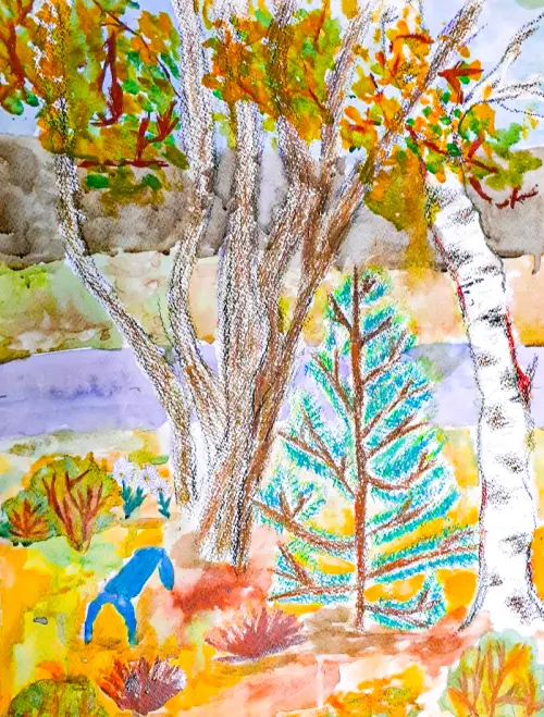 В нашем районе есть очень хороший детский центр культуры и спорта. Осенью мы с сестрой пришли в кружок рисования. И первые занятия у нас проходили на природе. Мы рисовали за мольбертами разные деревья.